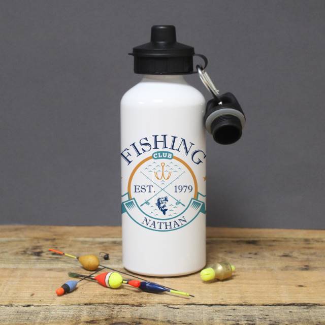 This fishing themed sports bottle can be personalised with a year and a name up to 15 characters. The material of the bottle is aluminium with the lid being plastic. The bottle holds up to 500ml and is not dishwasher or microwave friendly.