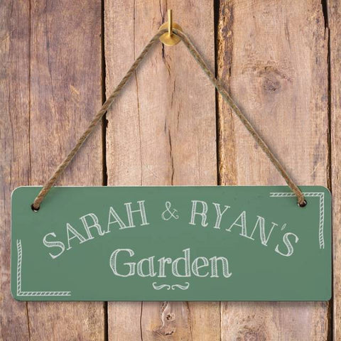 Personalise this green hanging gardening sign with any name or names up to 25 characters. Please note 'Garden' is fixed text. Finished with a high gloss and complete with hanging rope. The dimensions are: H: 10cm x W: 28cm x D: 0.5cm