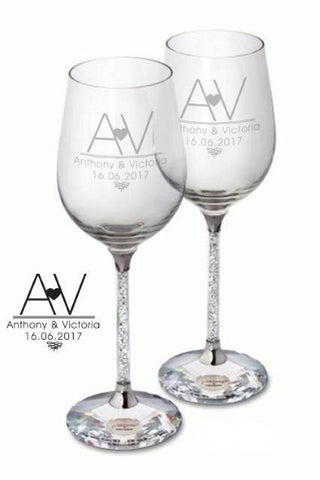 These gorgeous wine glasses make the perfect gift for any special occasion. We will engrave your unique message over 2 lines of 25 characters including spaces on both glasses below your selected 2 initials which will feature either side of a heart. The stem is filled with crystals and presented in a black gift box. Each glass is 24cm tall and 7cm diameter.