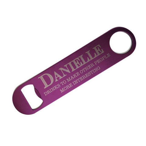 This stainless steel bottle opener is the easy yet effective way to open bottle tops. Personalise with a name of up to 15 characters above the fixed quote 'Drinks To Make Other People More Interesting'. Available in black or pink. Dimensions: W:17cm x H:4cm x D:0.2cm
